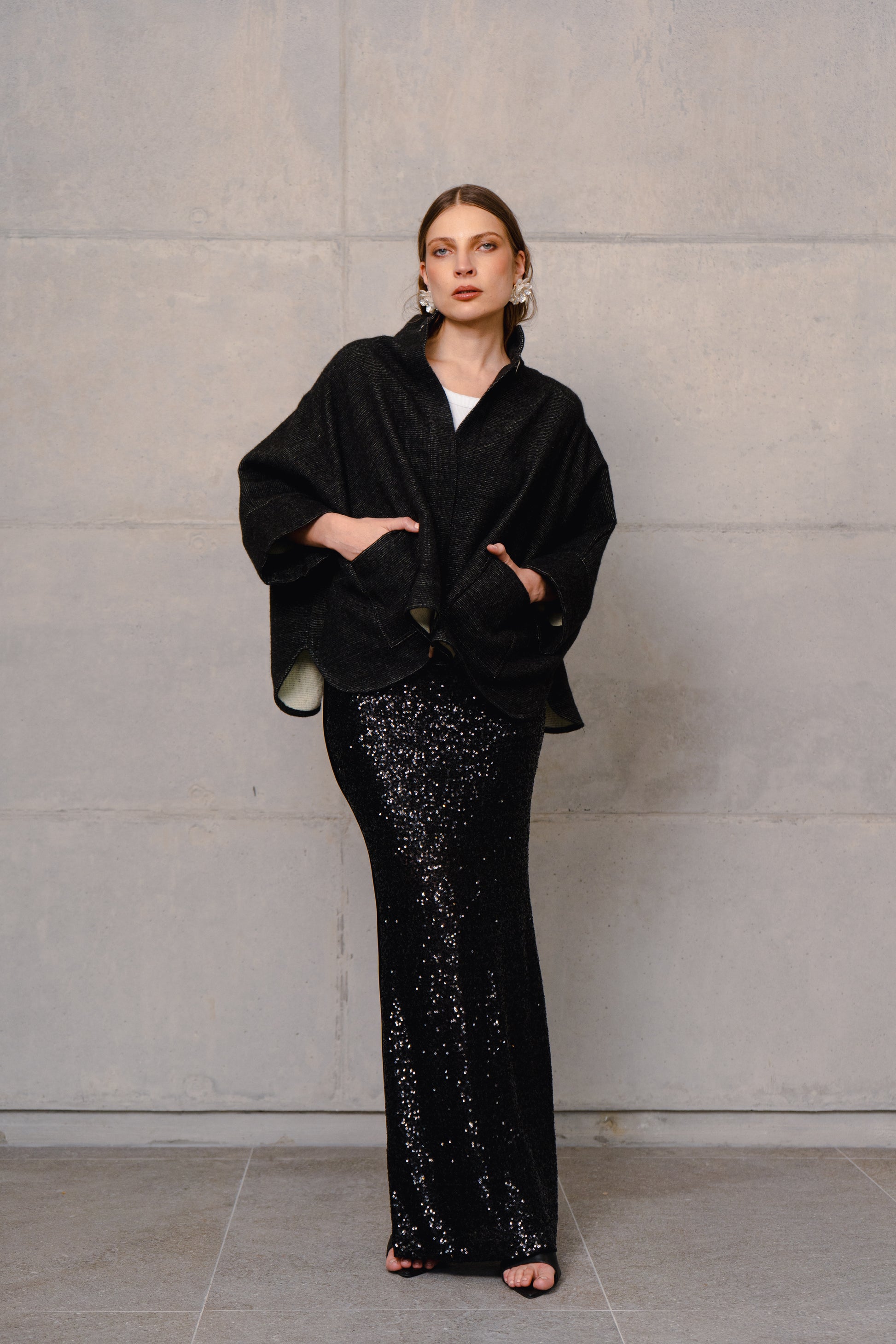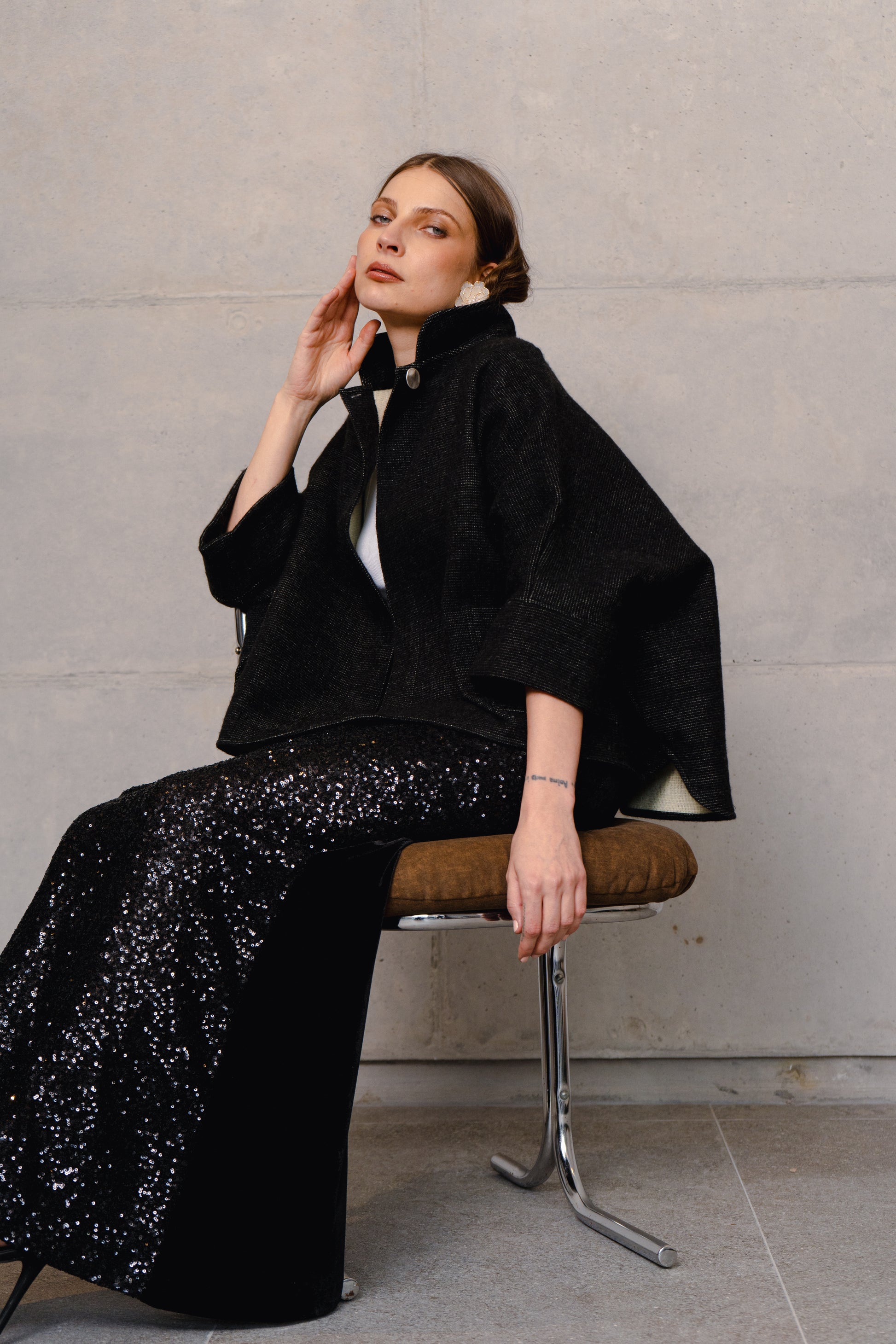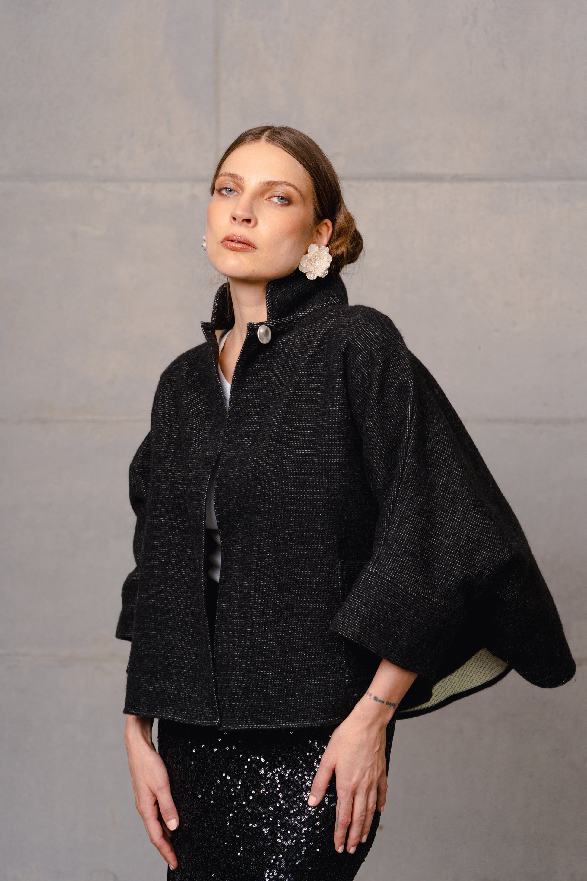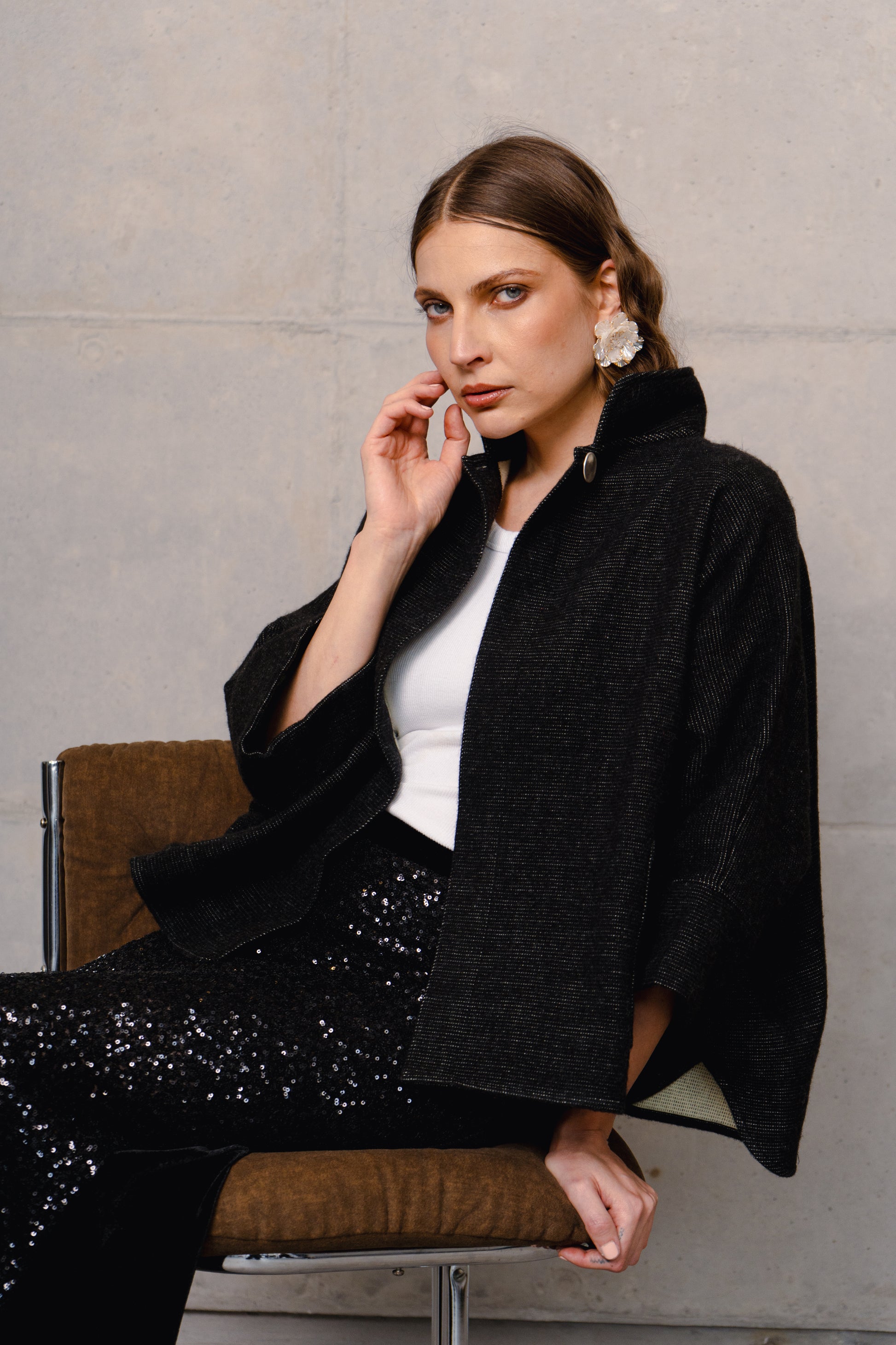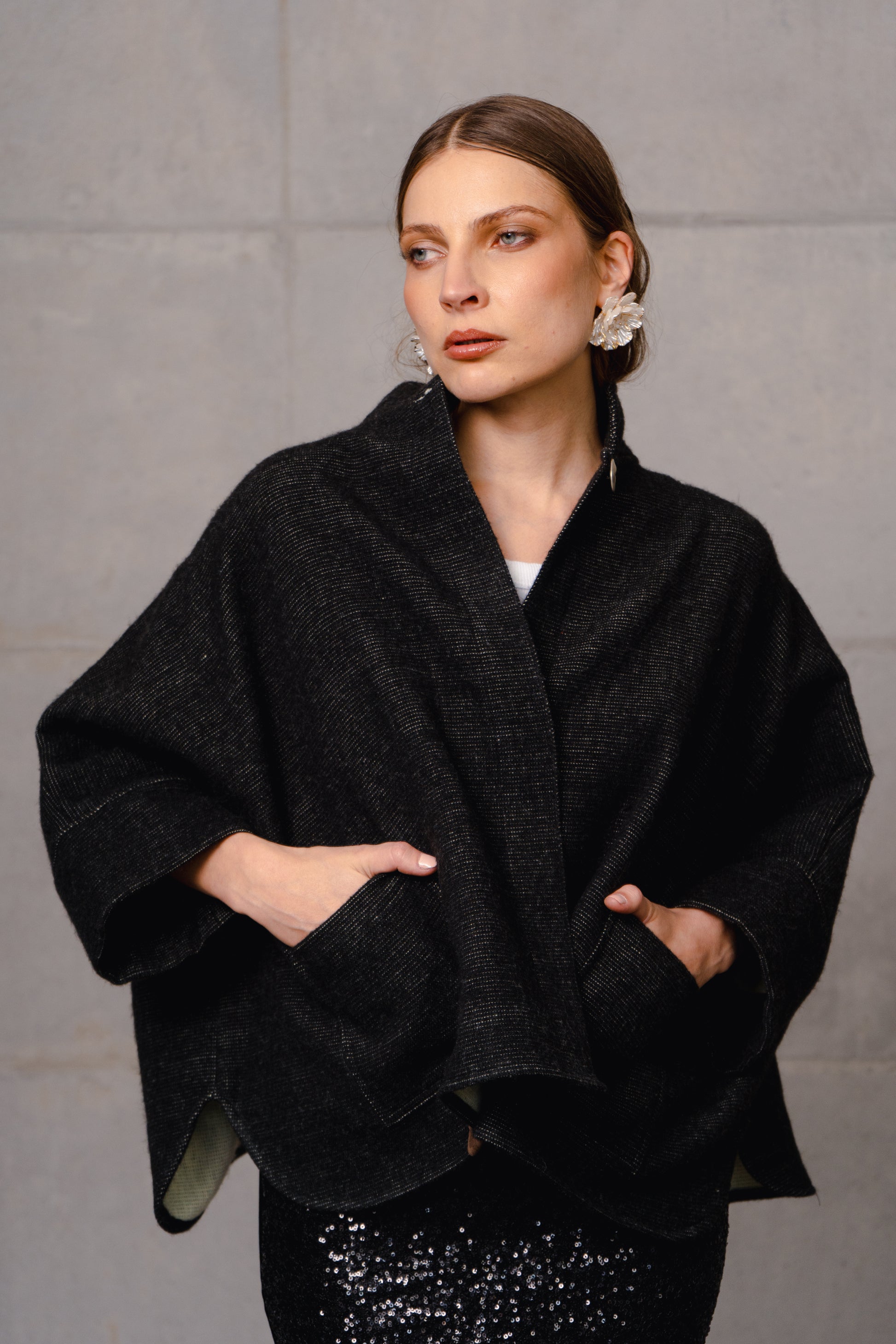 Killa es nuestra capa corta inspirada en la Ayllu, perfecta para quienes prefieren una opción ligera y moderna que cae justo por encima de la cadera. Está hecha con material reciclado e hipoalergénico, suave, de colores sólidos y pensada para acompañarte todos los días.